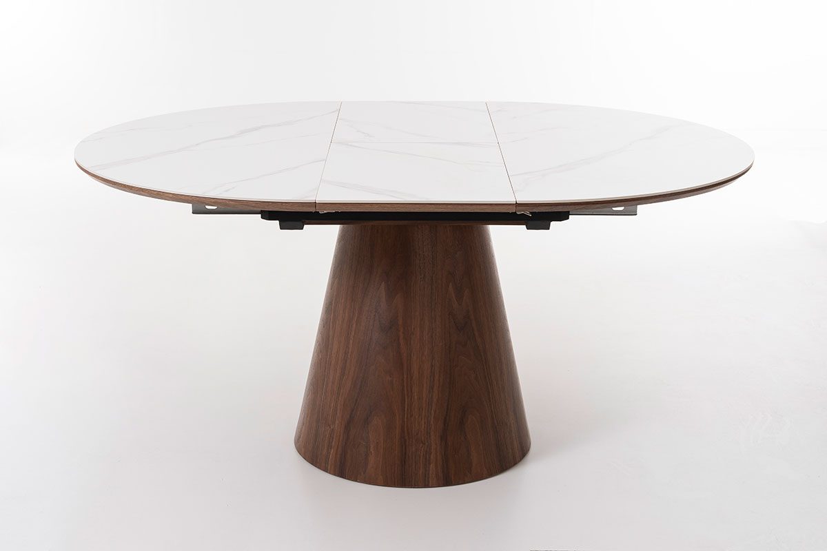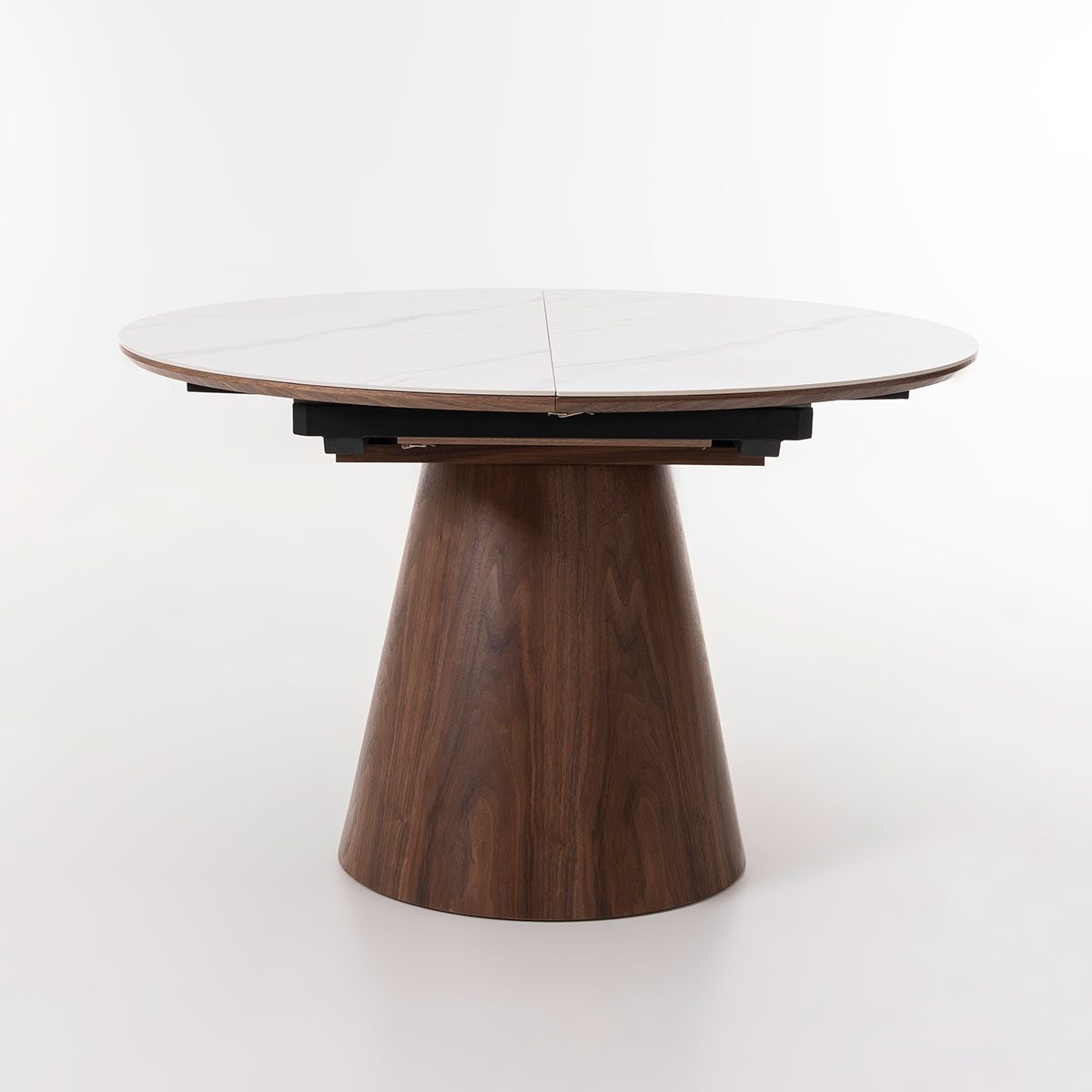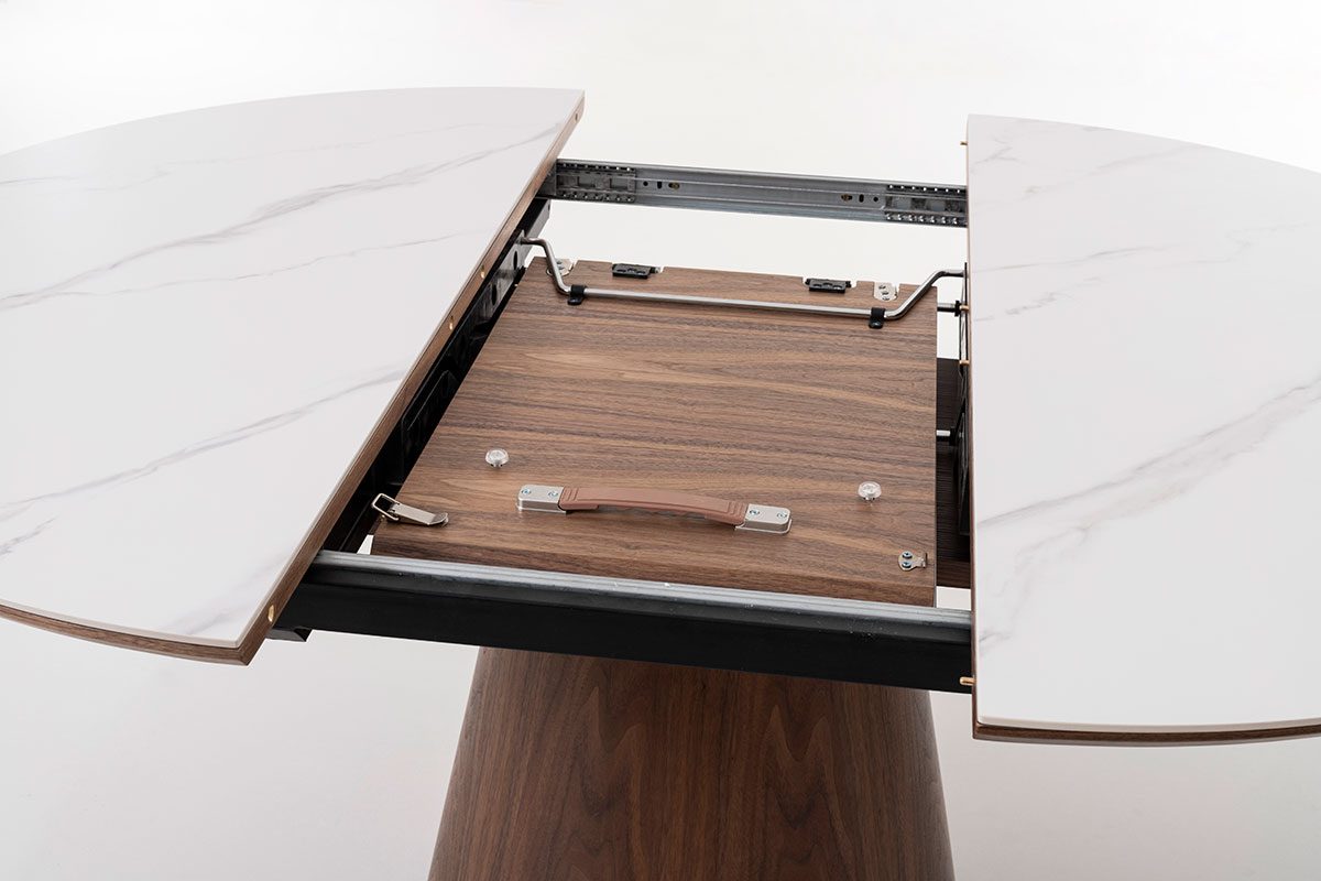 This extendable dining table combines contemporary design with warm, elegant materials to create a welcoming centerpiece for your dining space. The white porcelain tabletop adds a refined touch while being highly resistant and easy to clean—perfect for everyday use. The walnut-finished metal base brings warmth and stability, blending beautifully with modern, natural, or timeless interiors.