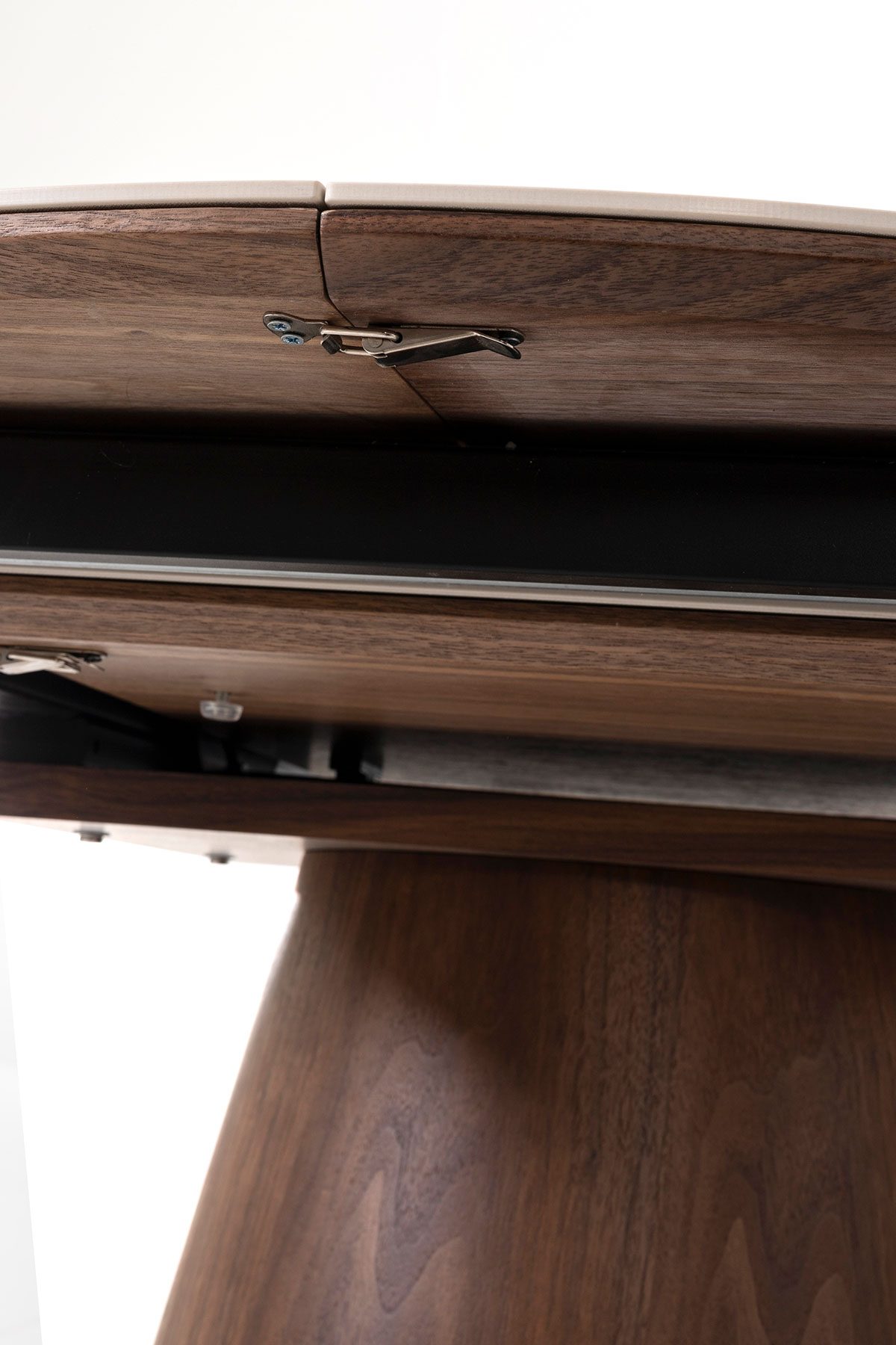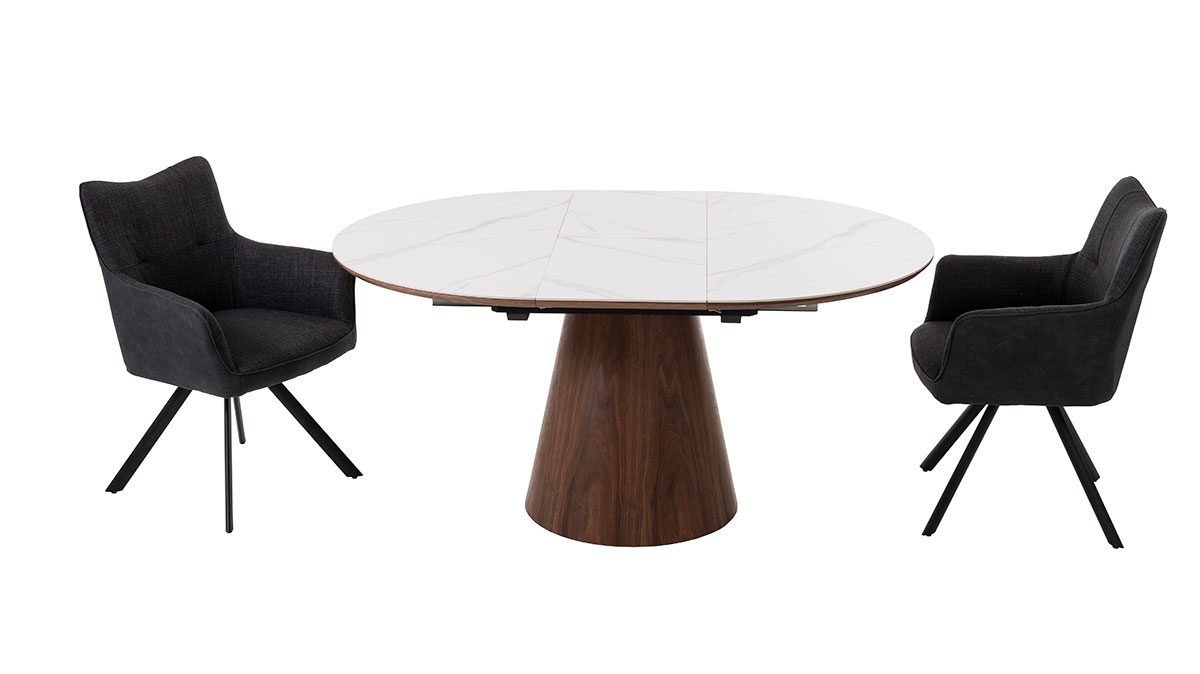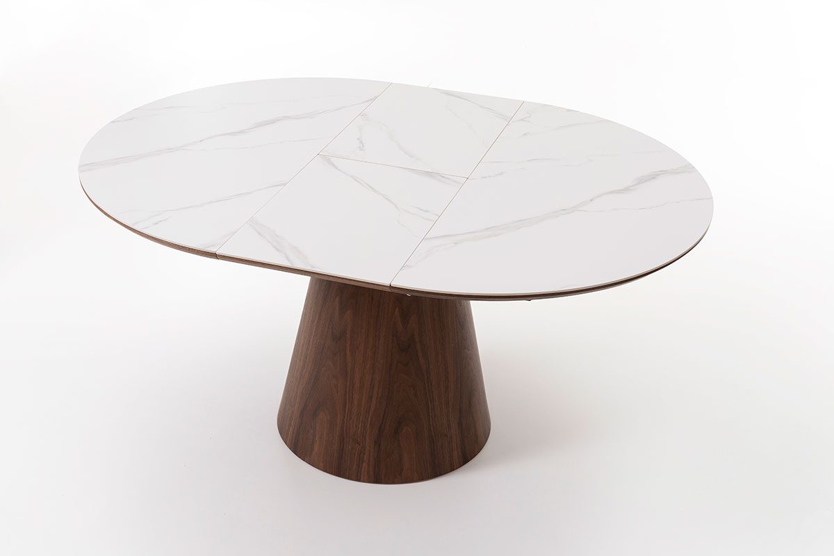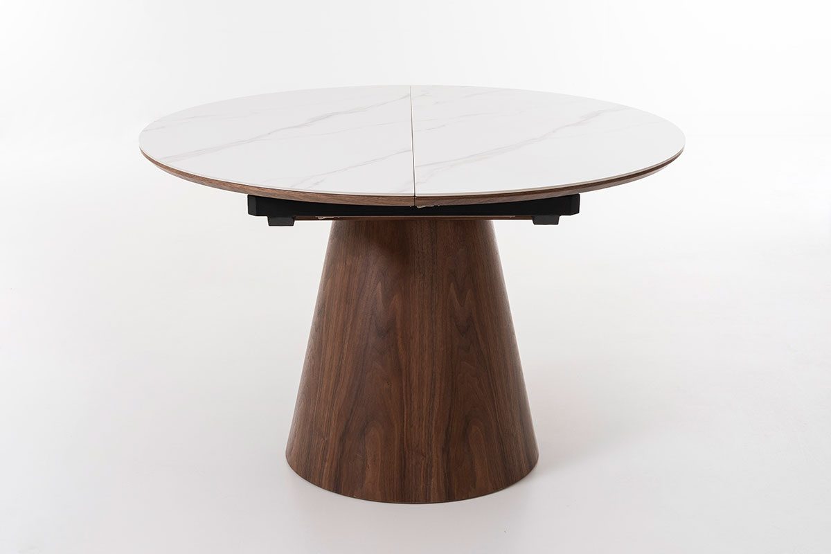 This extendable dining table combines contemporary design with warm, elegant materials to create a welcoming centerpiece for your dining space. The white porcelain tabletop adds a refined touch while being highly resistant and easy to clean—perfect for everyday use. The walnut-finished metal base brings warmth and stability, blending beautifully with modern, natural, or timeless interiors.