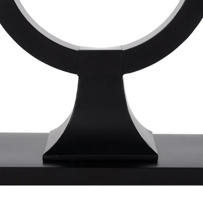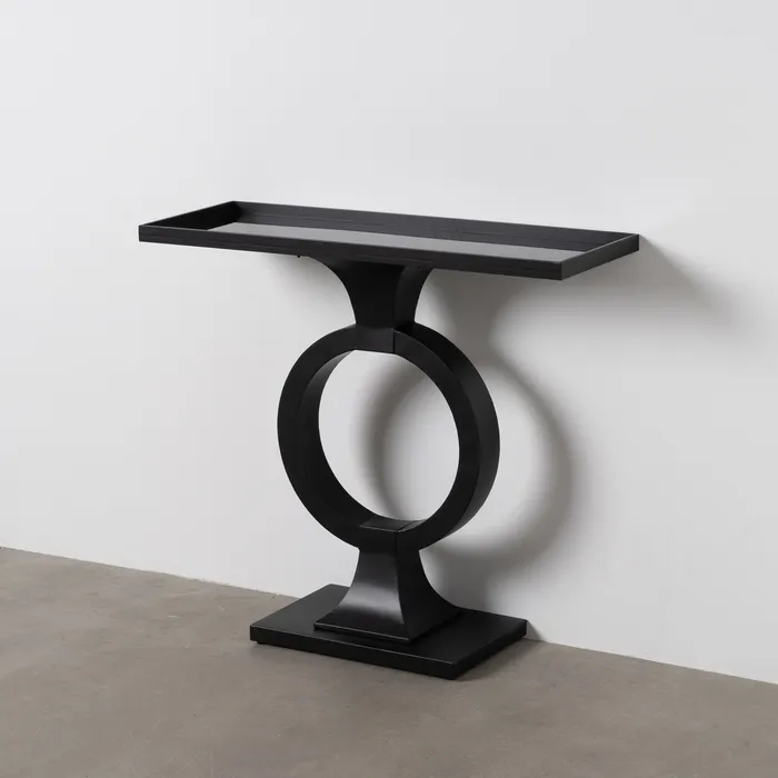 Crafted from solid iron with a sleek black finish, this console table stands out for its bold geometric design and elegant circular base. Its sculptural silhouette brings a refined, contemporary touch to any entryway or living space. Minimal yet striking, it’s a statement piece that combines strength, balance, and modern sophistication.