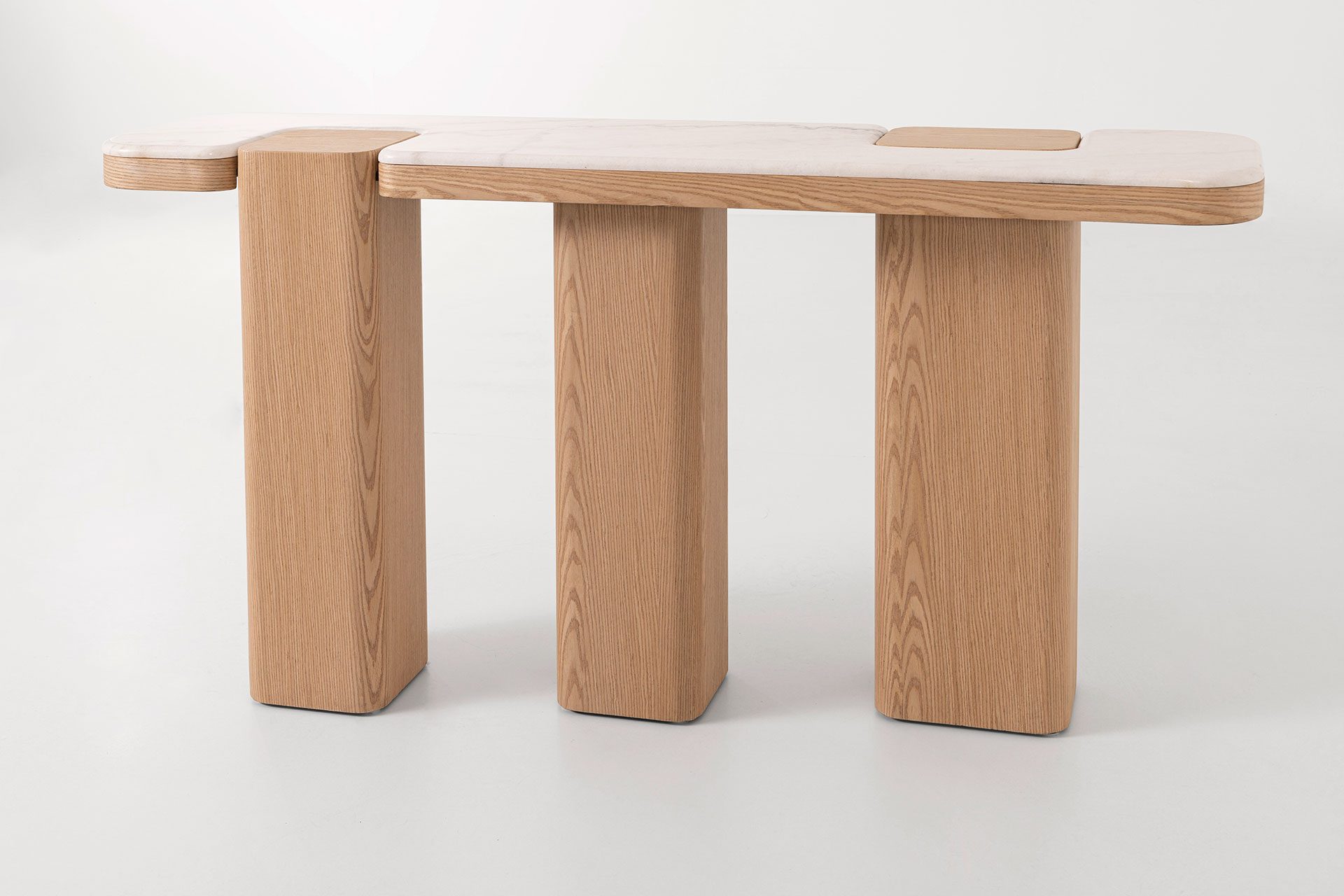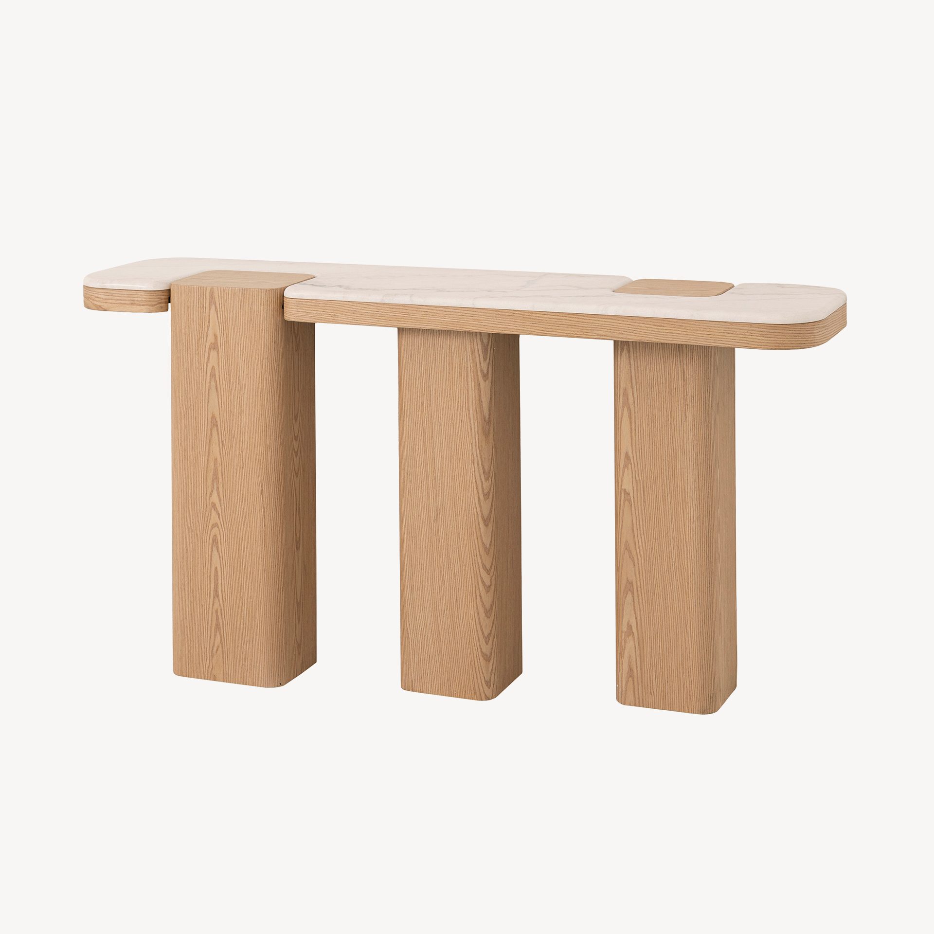 The 150 x 80 x 35 cm Delfos console table combines modern design, functionality, and high-quality materials. Its white porcelain top offers durability, easy cleaning, and an elegant finish, while the oak veneer frame provides warmth, sturdiness, and contemporary style. Perfect for displaying ornaments, lamps, or photo frames, it provides a functional space without sacrificing aesthetics. Its balanced design allows it to be easily integrated into different environments, from living rooms to hallways, providing functionality and elegance. The combination of porcelain and wood ensures durability, strength, and sophistication, making this console table a versatile, decorative, and practical piece of furniture that enhances any space in the home.