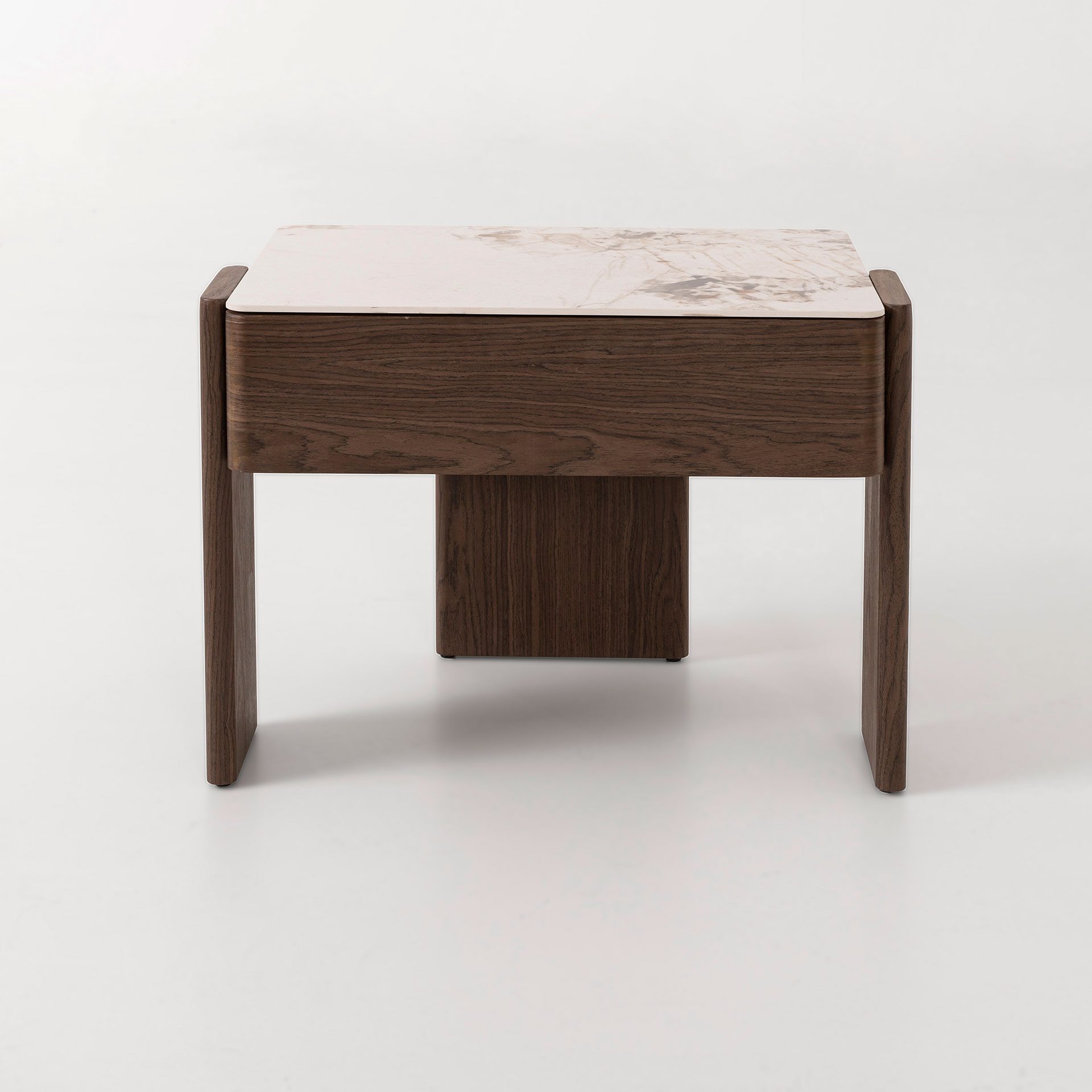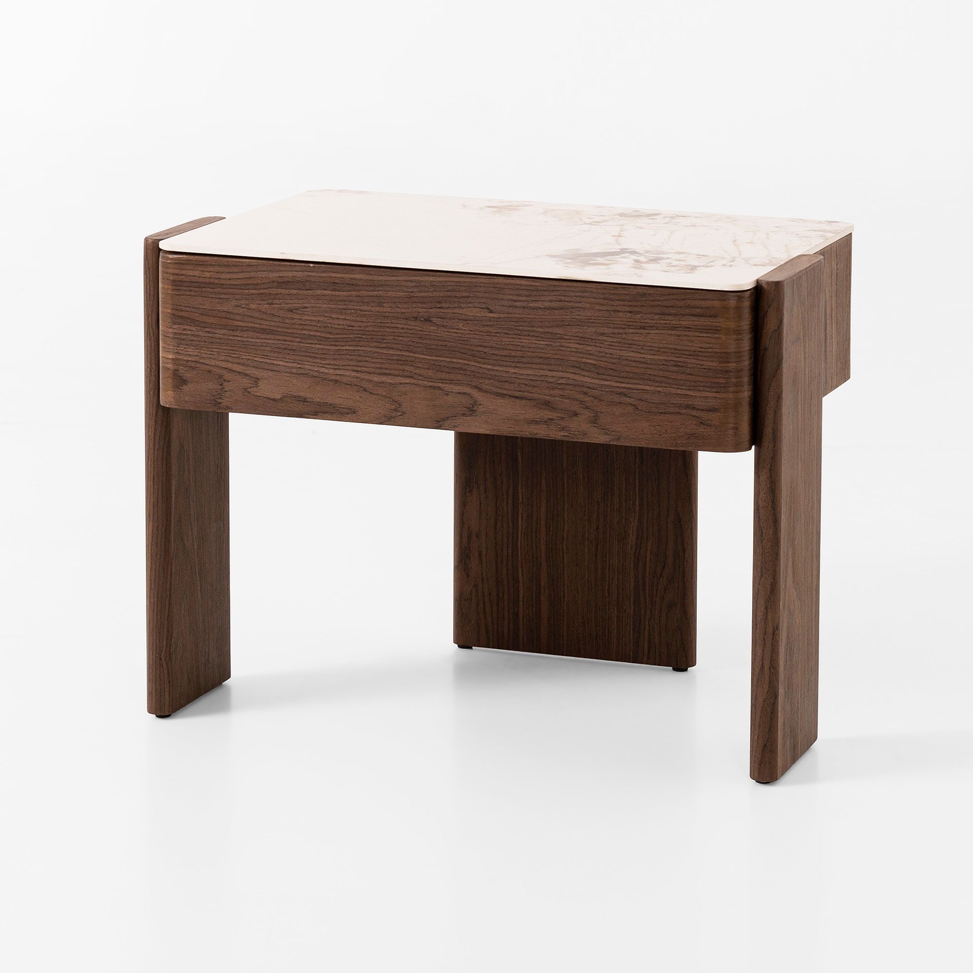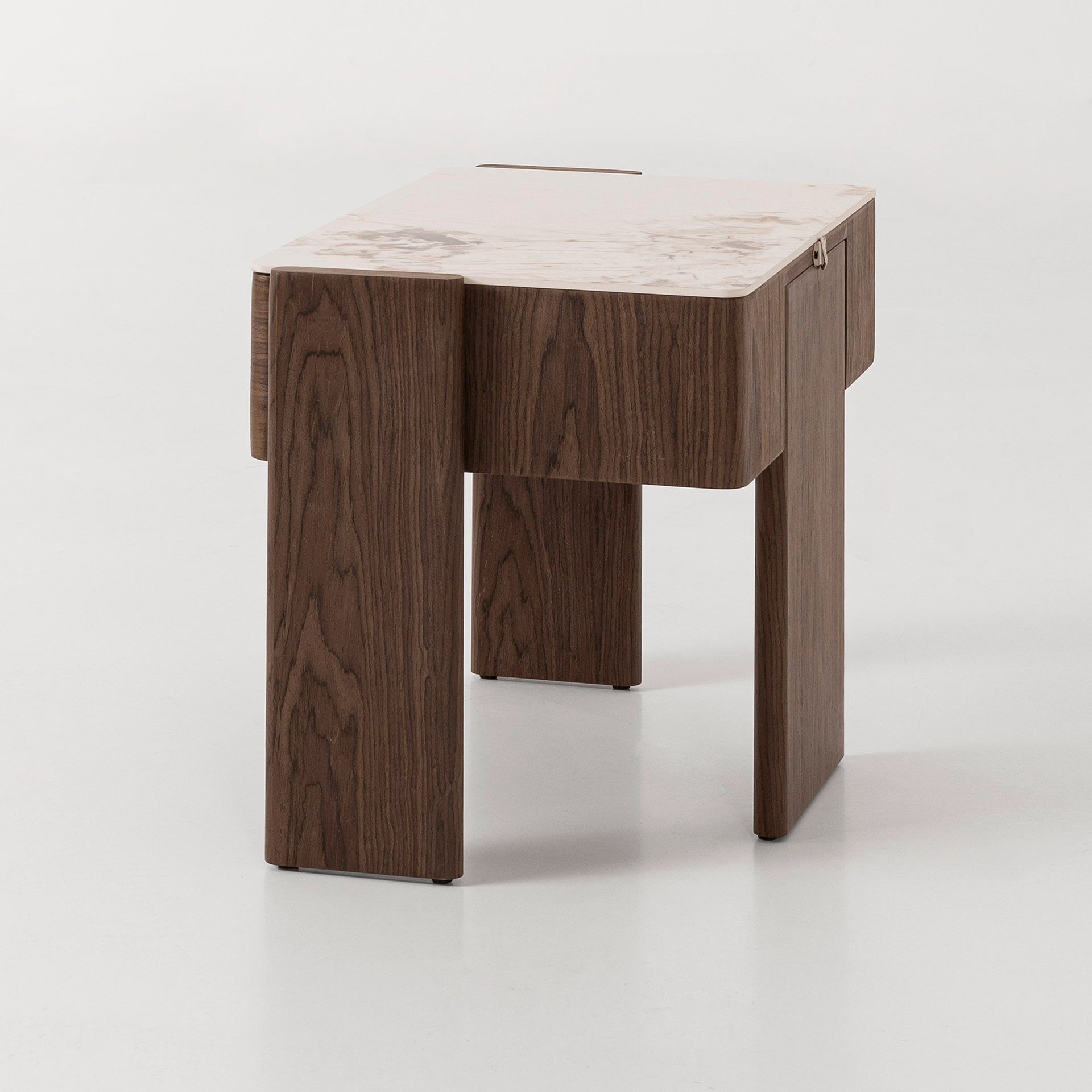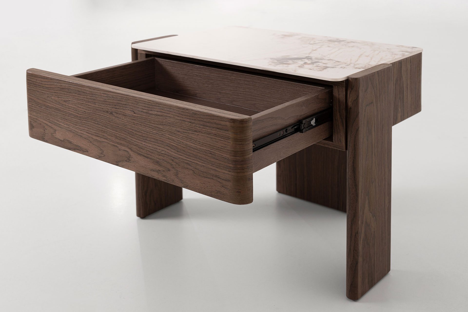 The Gio bedside table, measuring 60.5 x 38 x 45.5 cm, combines functionality, modern style, and high-quality materials. Its white porcelain top provides an elegant, scratch-resistant, and easy-to-clean finish, while the walnut veneer frame adds warmth, durability, and a sophisticated touch that enhances any bedroom or living room. It features a drawer, ideal for storing small objects, accessories, or personal items, keeping the space organized and clean. Its compact and elegant design allows it to be placed next to a bed, sofa, or armchair, providing functionality without taking up too much space. The combination of porcelain and walnut ensures durability and an elegant finish, making it a versatile and decorative piece of furniture that combines aesthetics and practicality.