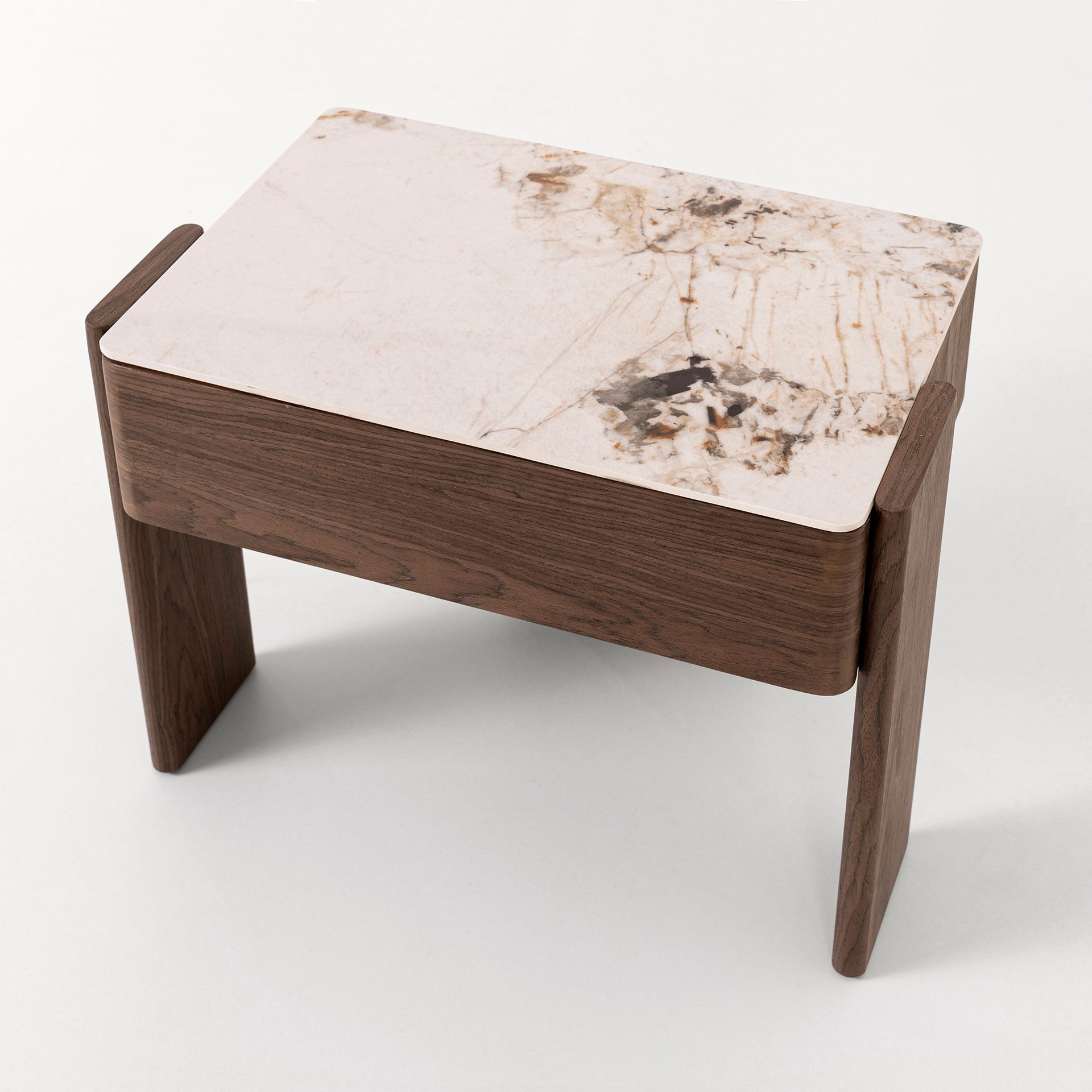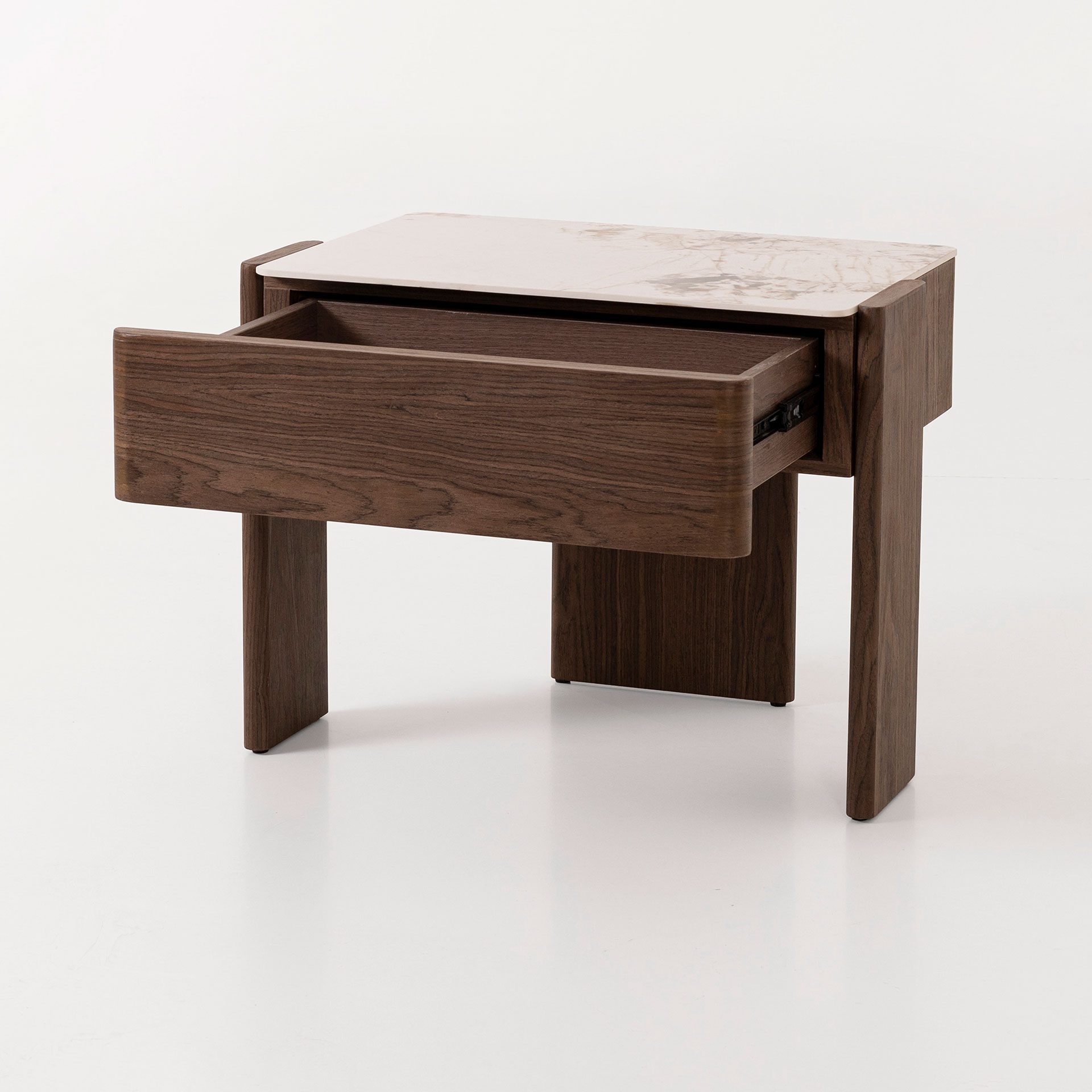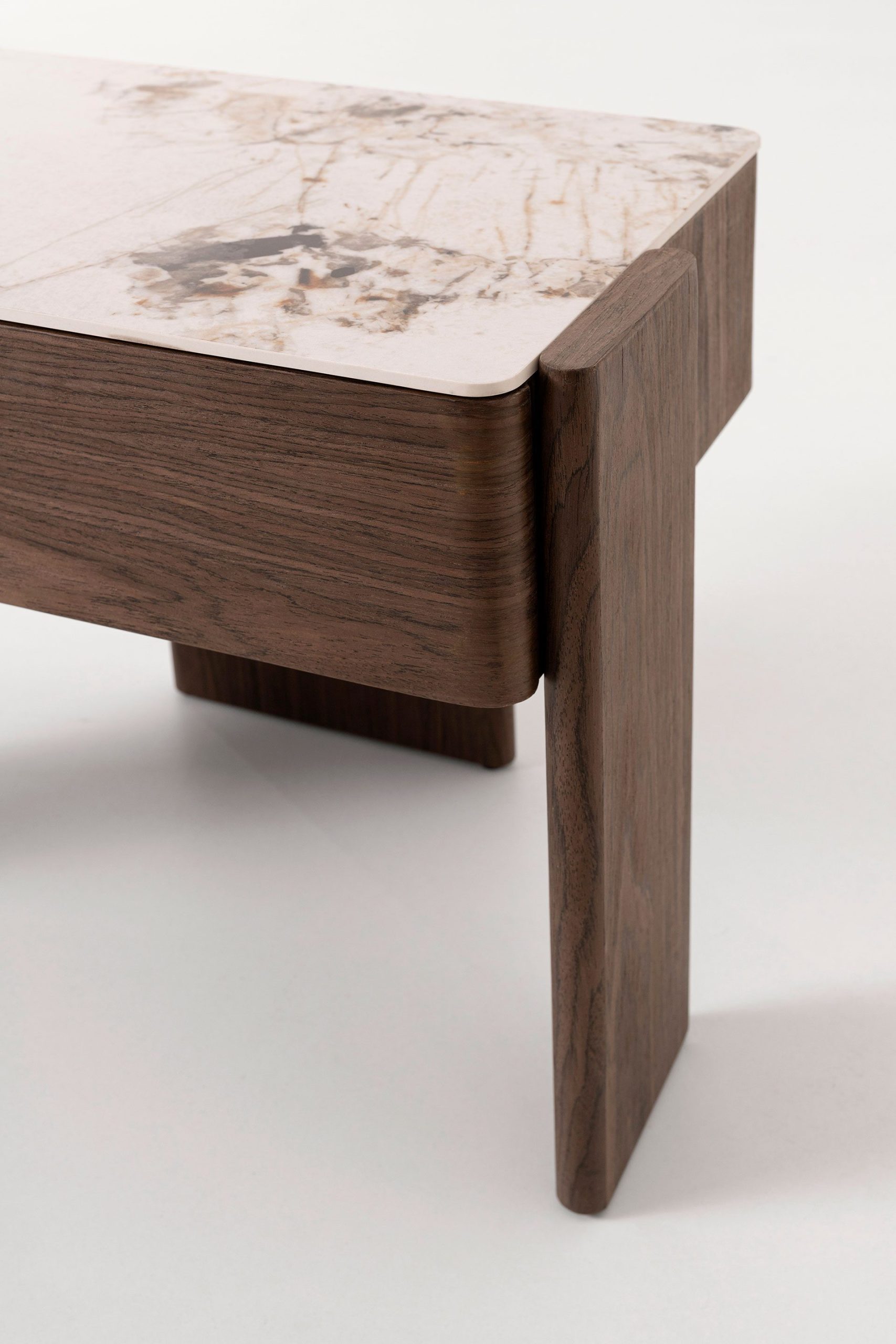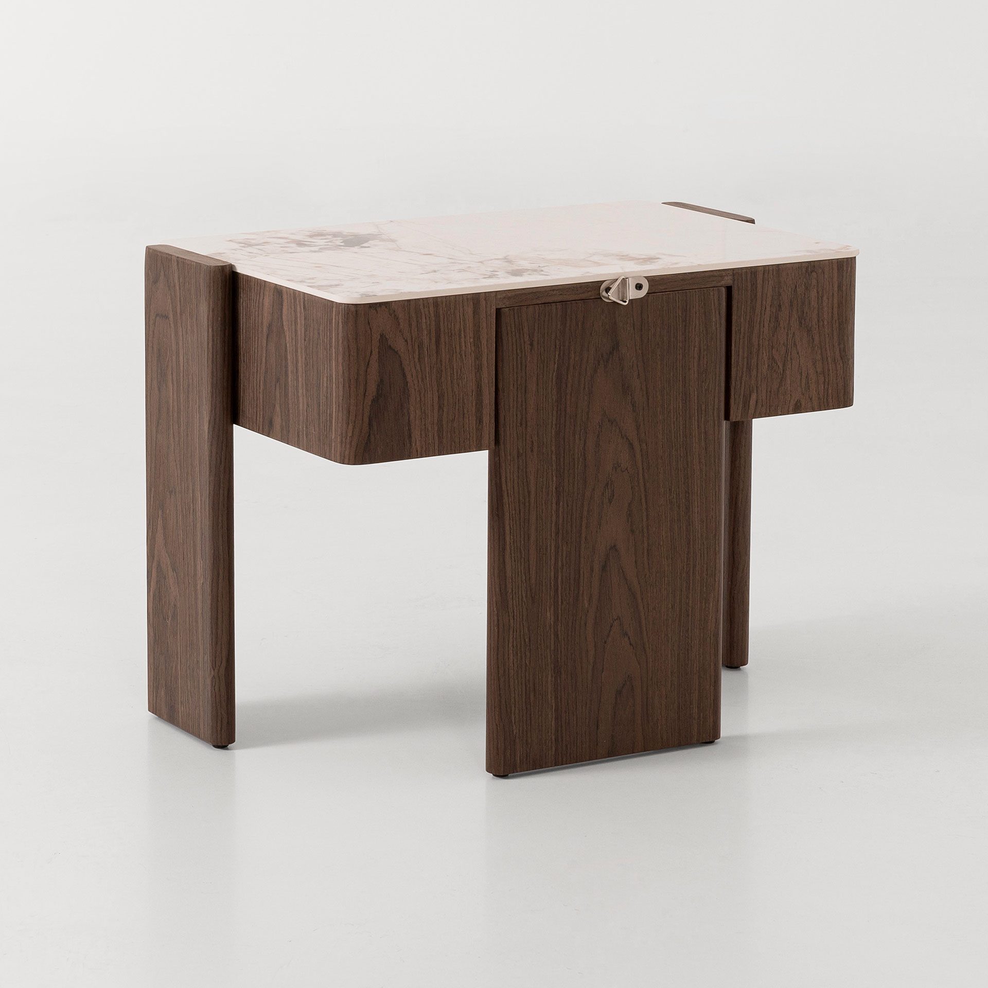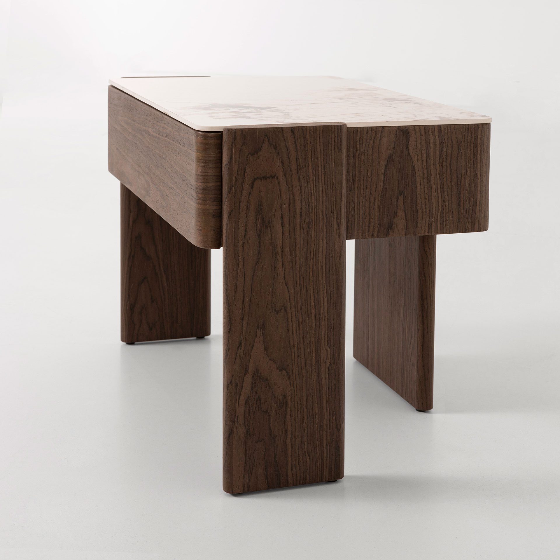 The Gio bedside table, measuring 60.5 x 38 x 45.5 cm, combines functionality, modern style, and high-quality materials. Its white porcelain top provides an elegant, scratch-resistant, and easy-to-clean finish, while the walnut veneer frame adds warmth, durability, and a sophisticated touch that enhances any bedroom or living room. It features a drawer, ideal for storing small objects, accessories, or personal items, keeping the space organized and clean. Its compact and elegant design allows it to be placed next to a bed, sofa, or armchair, providing functionality without taking up too much space. The combination of porcelain and walnut ensures durability and an elegant finish, making it a versatile and decorative piece of furniture that combines aesthetics and practicality.