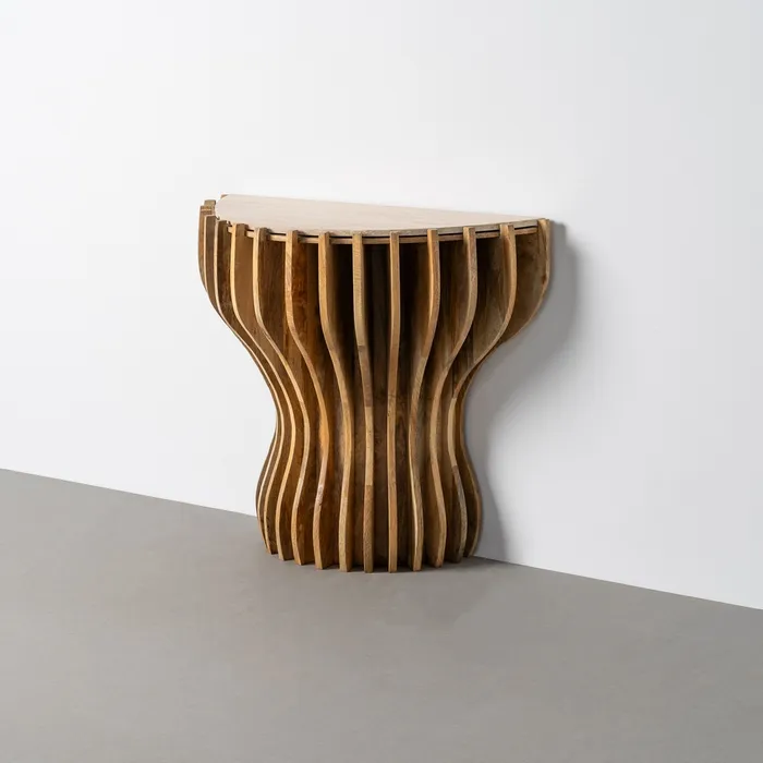 This striking console table combines the warmth of solid mango wood with the elegance of a marble top. Its sculptural, curved wooden slats create a dynamic and artistic silhouette, making it a true statement piece.